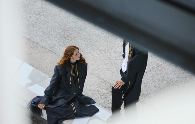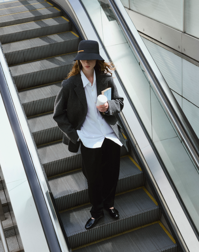 La emblemática gabardina Pradel, con su amplio volumen, se presenta en dos tonos: masilla y antracita. A su alrededor, se perfila una nueva