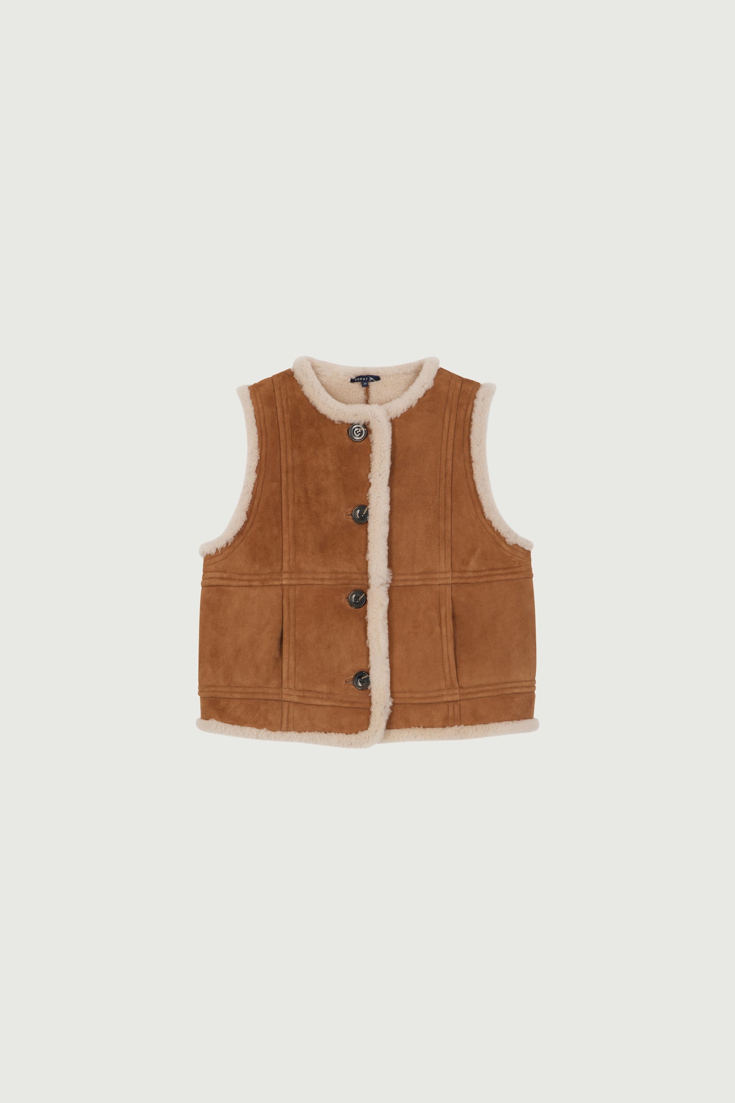 VILLAGE es una chaqueta sin mangas de piel de oveja. Nuestras chaquetas sin mangas son imprescindibles en el armario de Soeur. Los bolsillos ocultos en la parte delantera añaden un toque desenfadado y oversize.