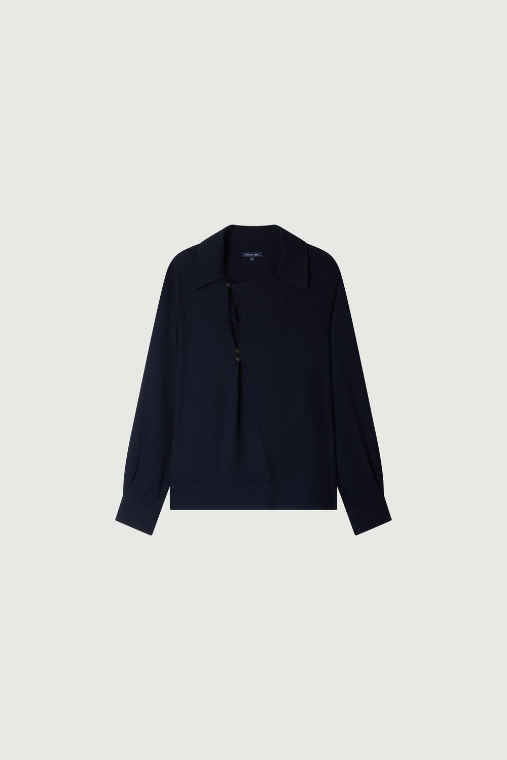 CAMELIA es una blusa de crepé de lana ligera. Esta es ideal para un look elegante y refinado, combina confort y sofisticación con un tejido aéreo de crepé de lana sutilmente transparente.