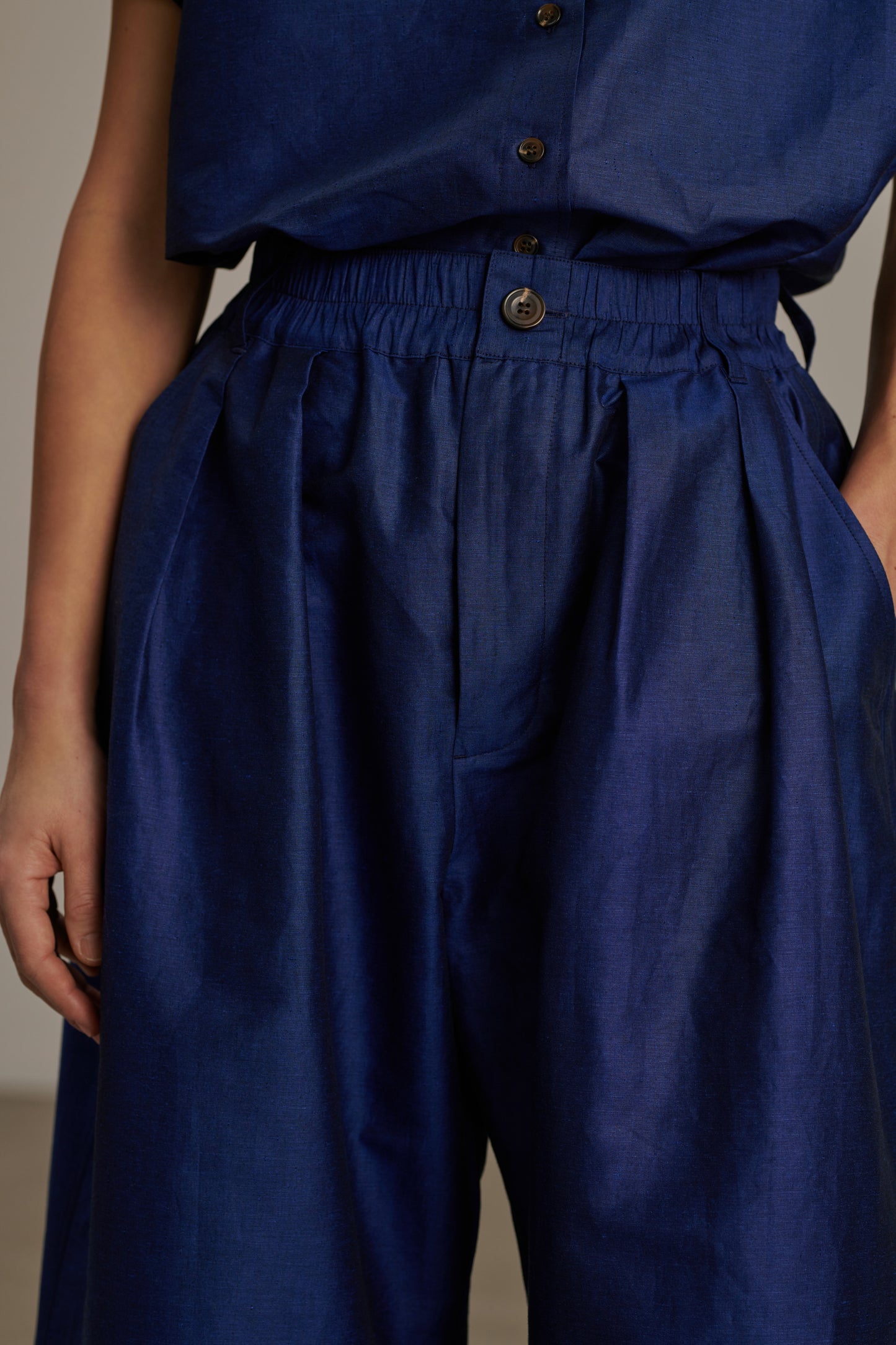 CAMERON es un pantalón amplio, con la pierna redondeada. Su material es un algodón-lino chintz, un tejido elegante y ligeramente brillante.