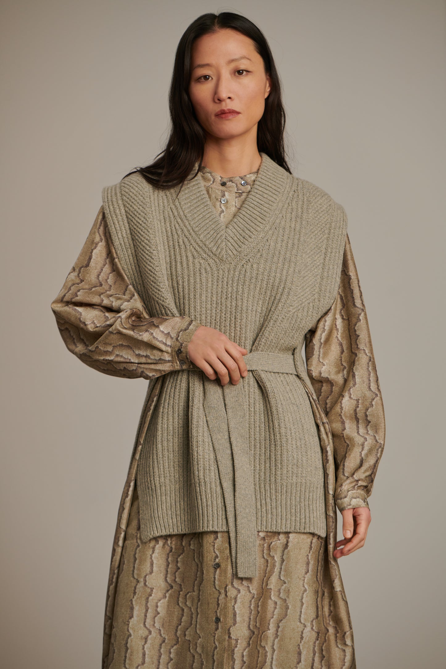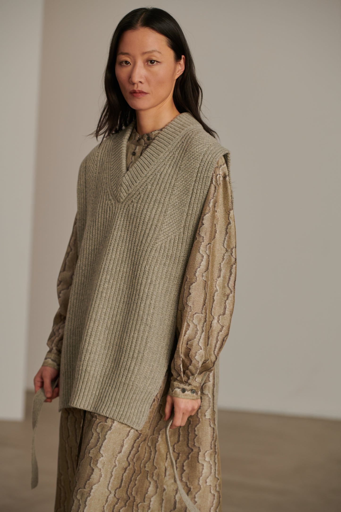 COSTA es un peto recto, tejido en un hilo de lana virgen. Efecto visual conseguido por un diseño de canalé, los lazos en los laterales se llevan ceñidos para marcar la cintura o se dejan colgando. Una prenda ideal para dar calidez a un conjunto, como un vestido de seda o una camisa holgada de algodón.