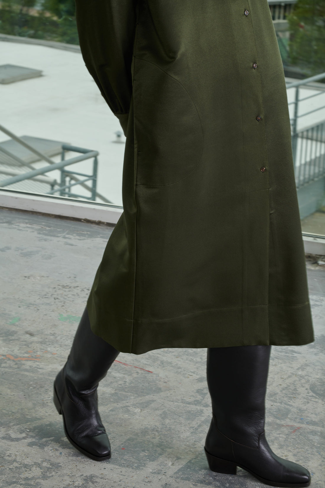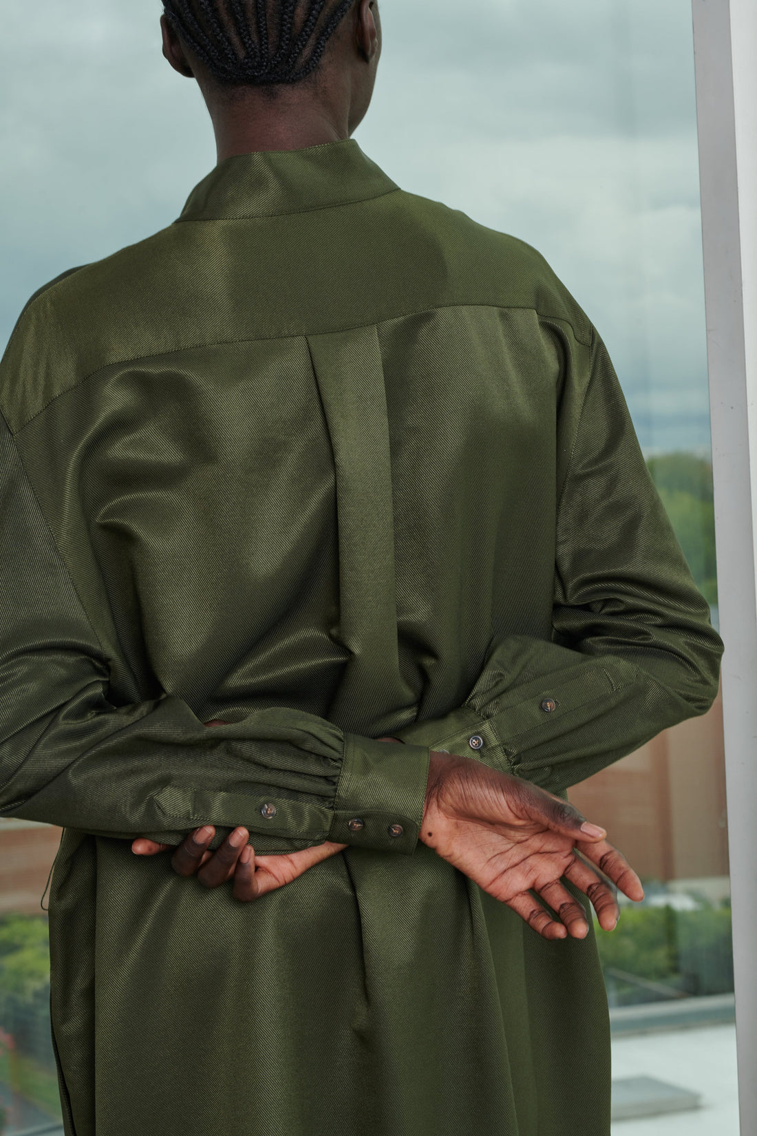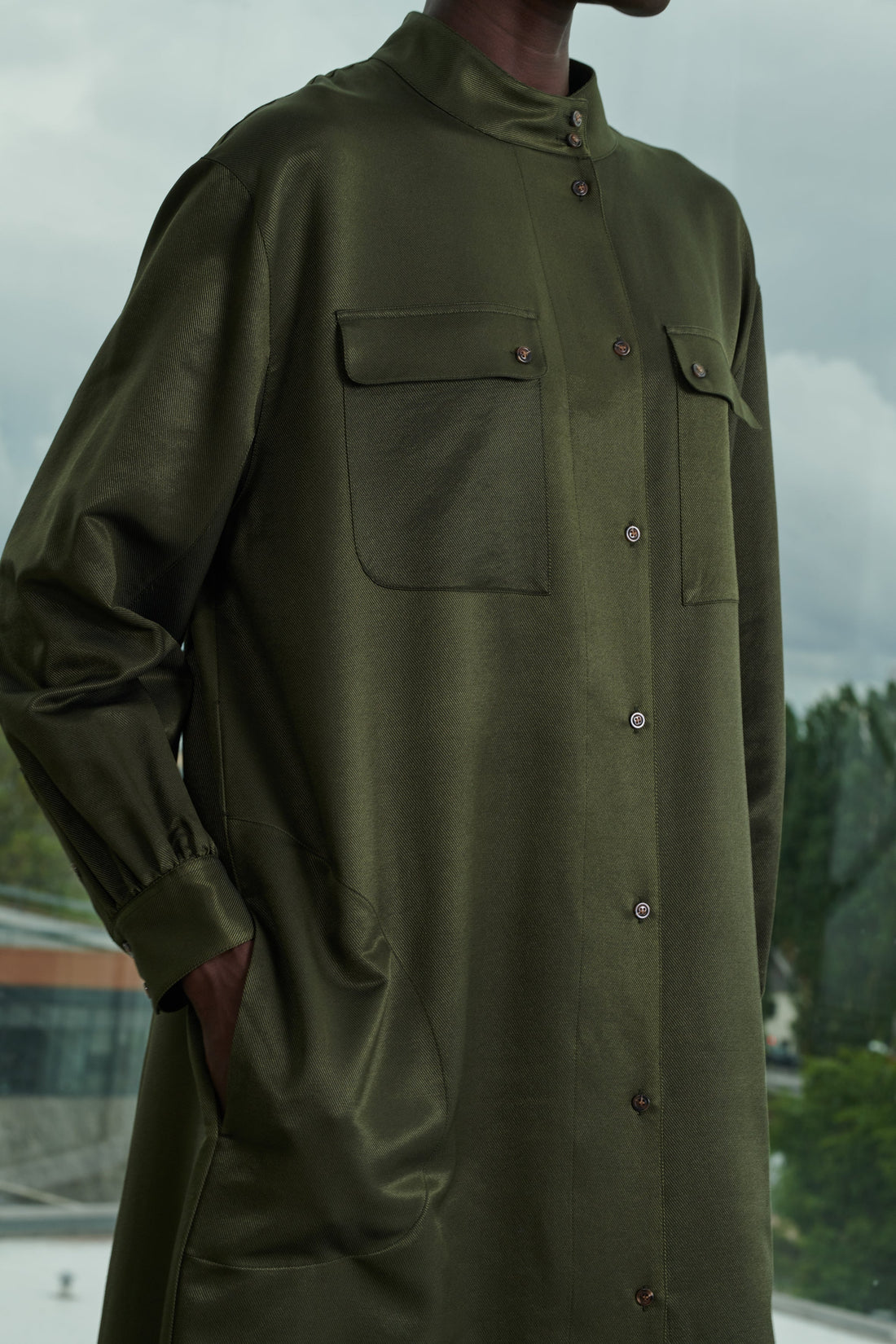 Vestido con cuello abotonado de sarga de seda estampada caqui