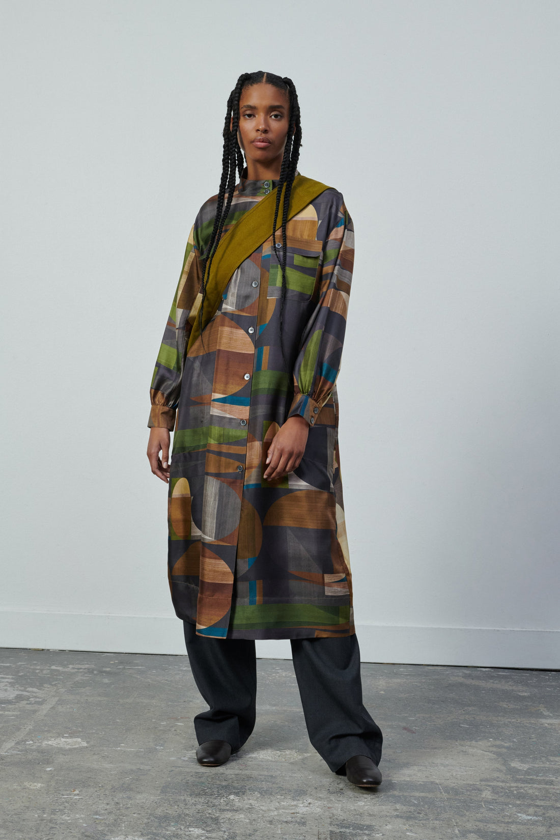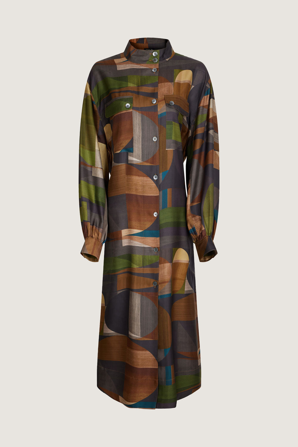 Vestido con cuello abotonado de sarga de seda estampada verde/marrón