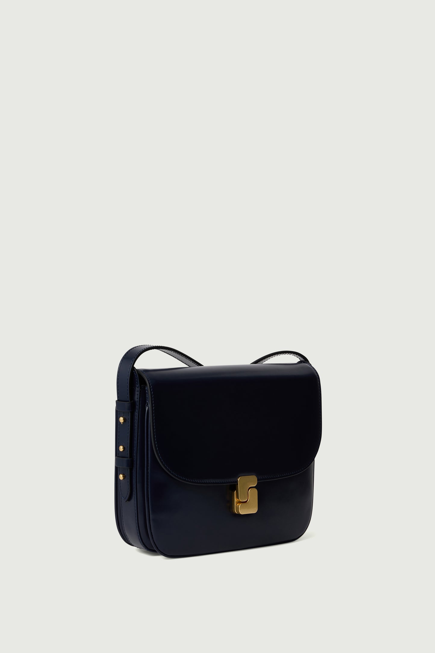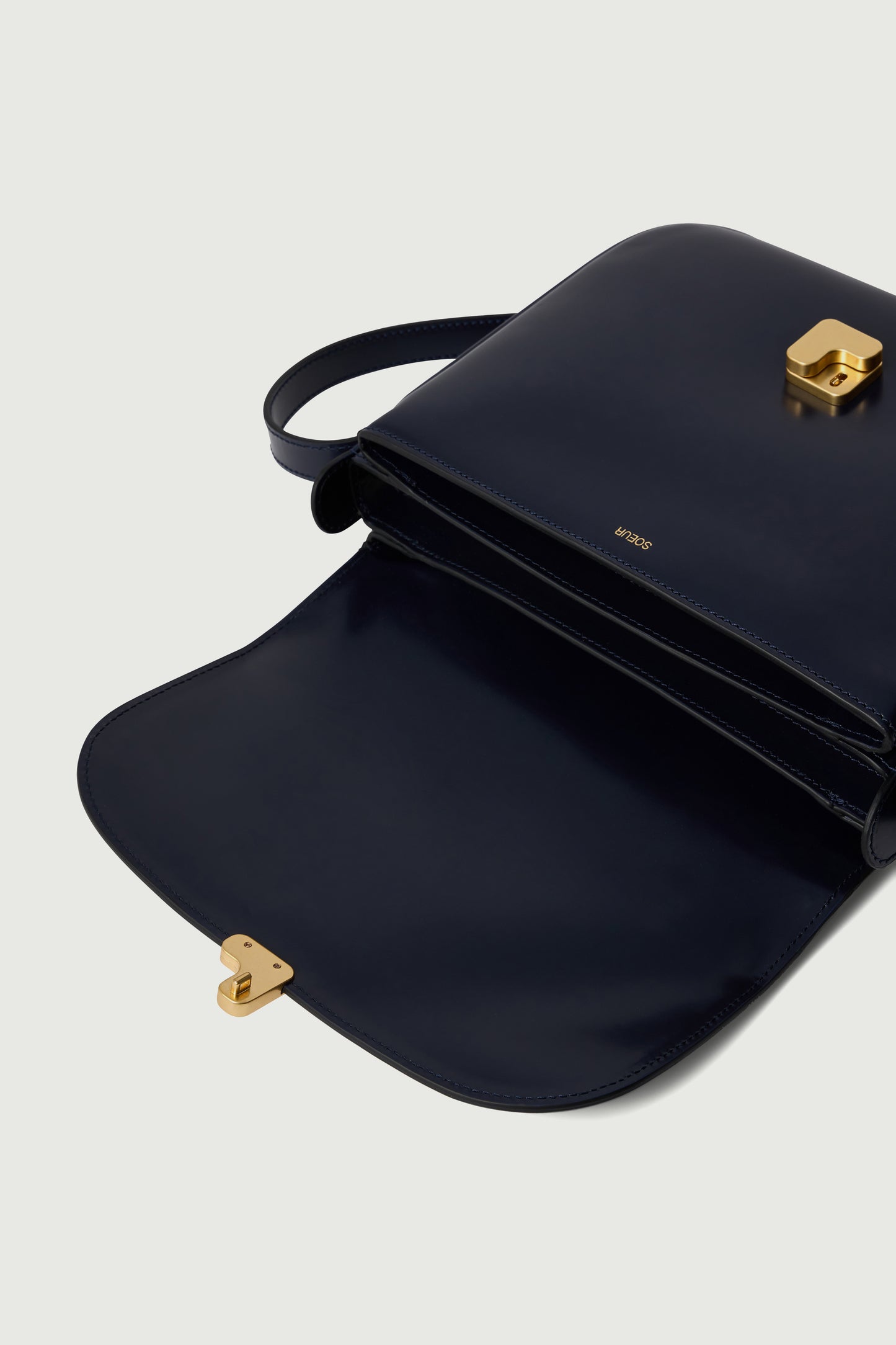 - Gran solapa frontal con cierre con monograma «S» dorado